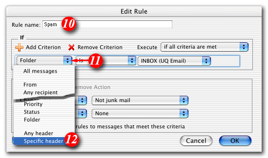 For example, if you wanted to consider anything with a score of 4 or more to be spam, the rule would look like: 'X-SpamDetect: ***'. Decreasing the number of asterisks will result in classifying more e-mails as spam. You may need to check your spam folder more carefully for non-spam e-mails that might have been classified as spam. If you wanted to rate anything with a score of 8 or greater as spam, the rule would look like: 'X-SpamDetect: ********'. Increasing the number of asterisks may result in fewer filtered e-mails being classified as spam and more potential spam staying in your Inbox.